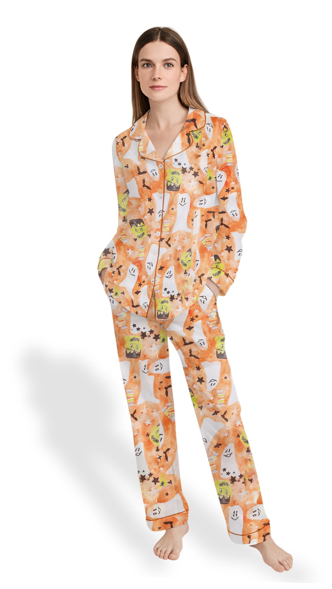 Women’s Halloween Pajama Set – Cute Ghosts & Pumpkins Satin PJs