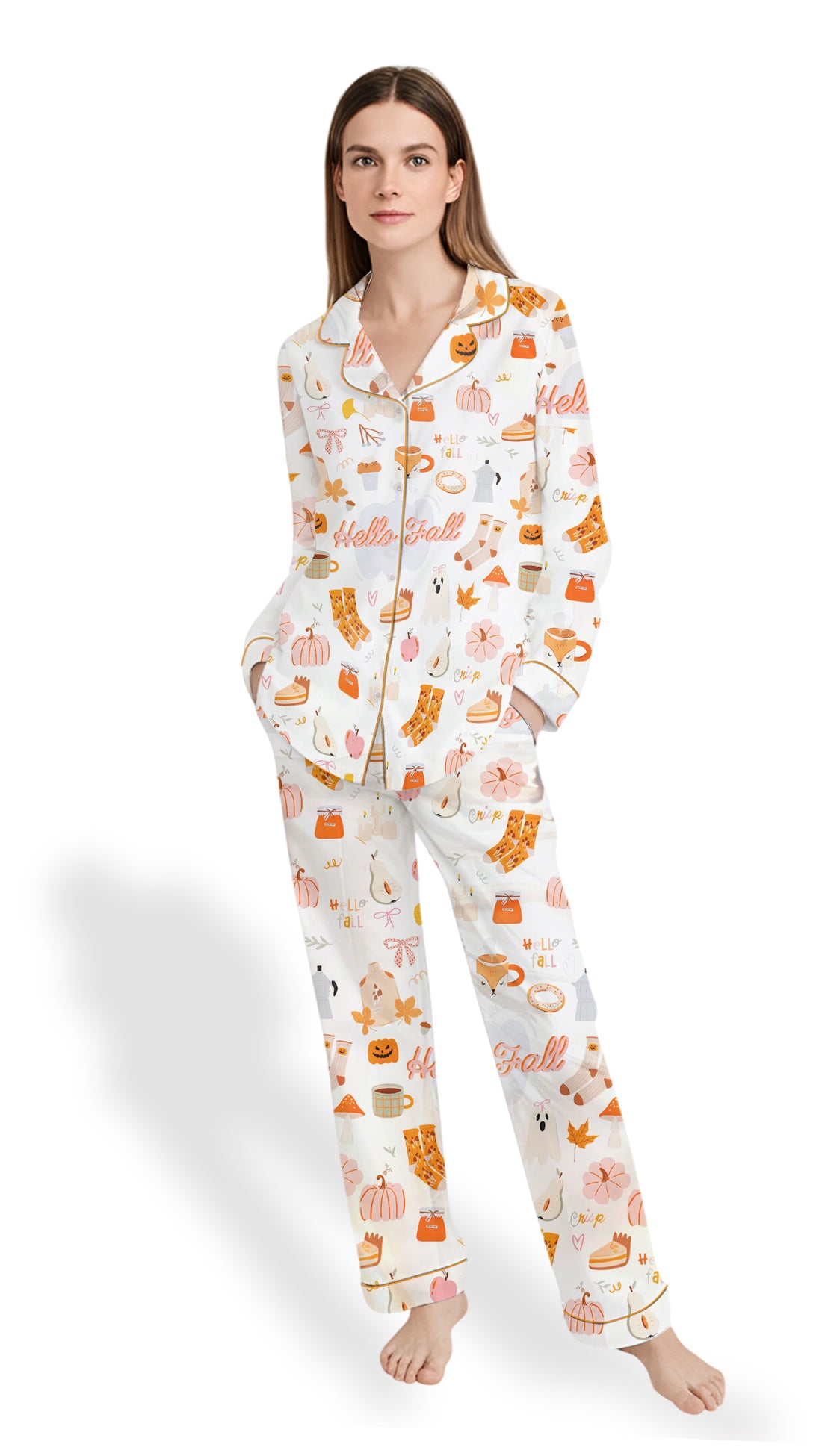 Women’s Fall Cozy Halloween Satin Pajama Set – Pumpkin Spice & Ghost Print