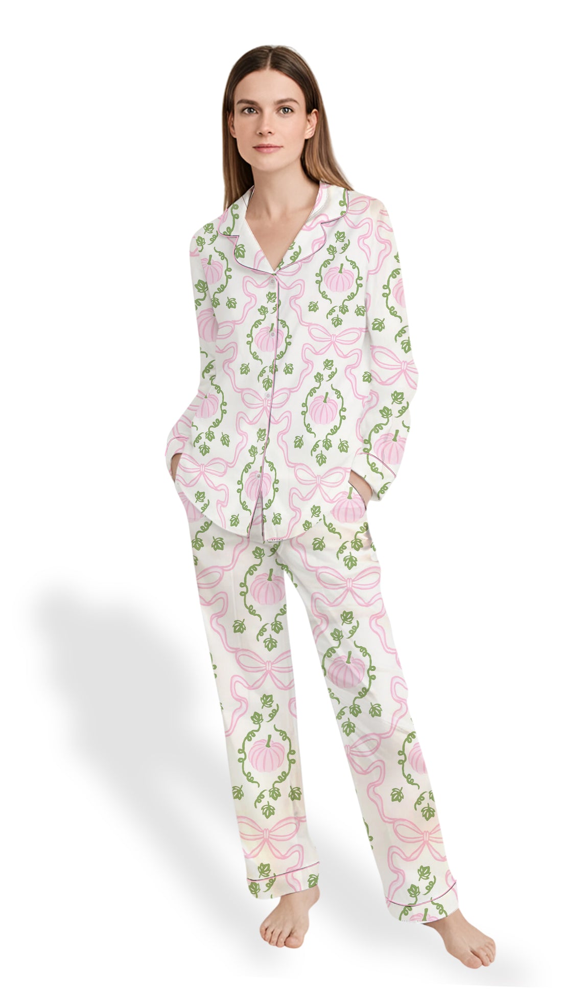 Pink Pumpkin & Bow Trellis Satin Sleepwear- Women’s Fall Pajama Set