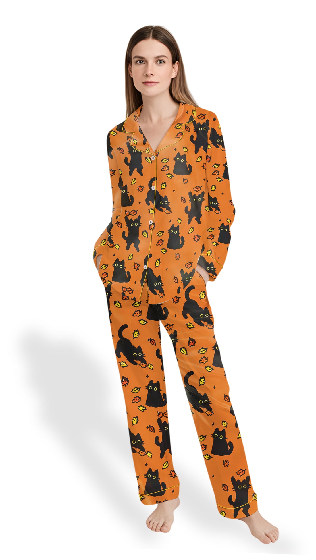 Women’s Black Cat Fall Halloween Satin Pajama Set