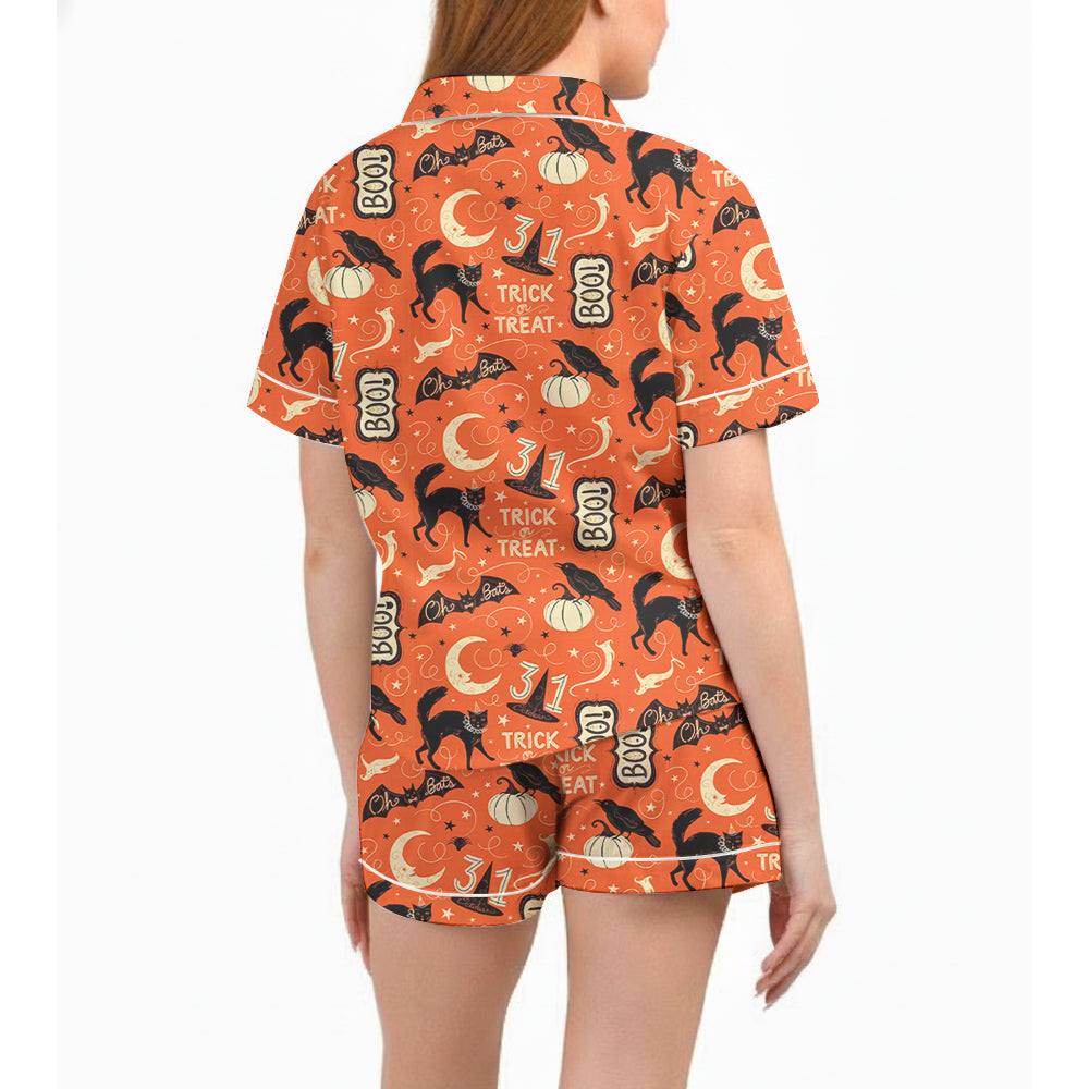 Get spooky and stylish with this Halloween Vintage Halloween Trick Or Treat Boo Black Cat Pumpkin Bat Pajama Set.
