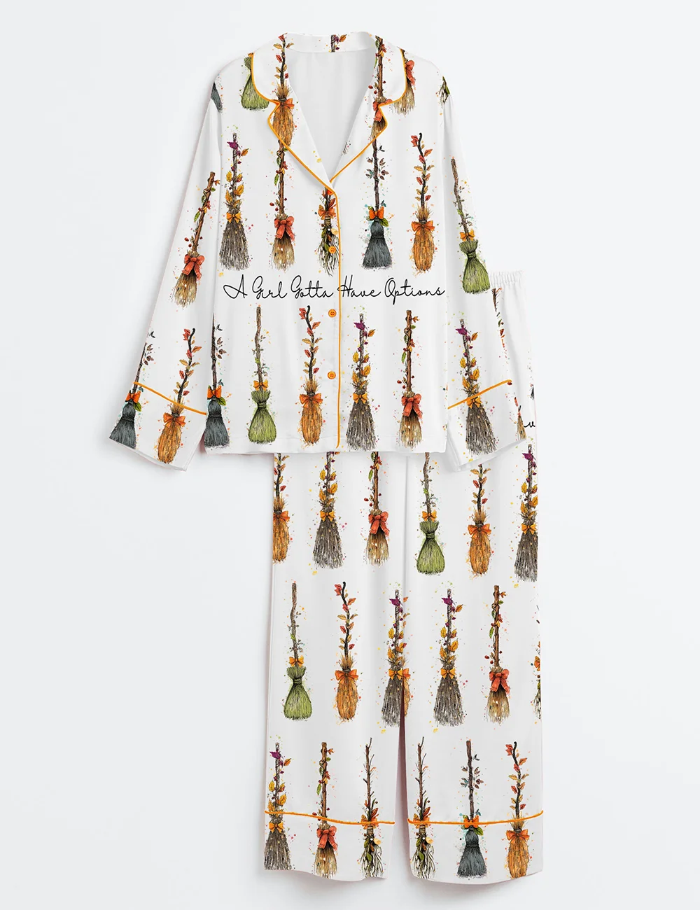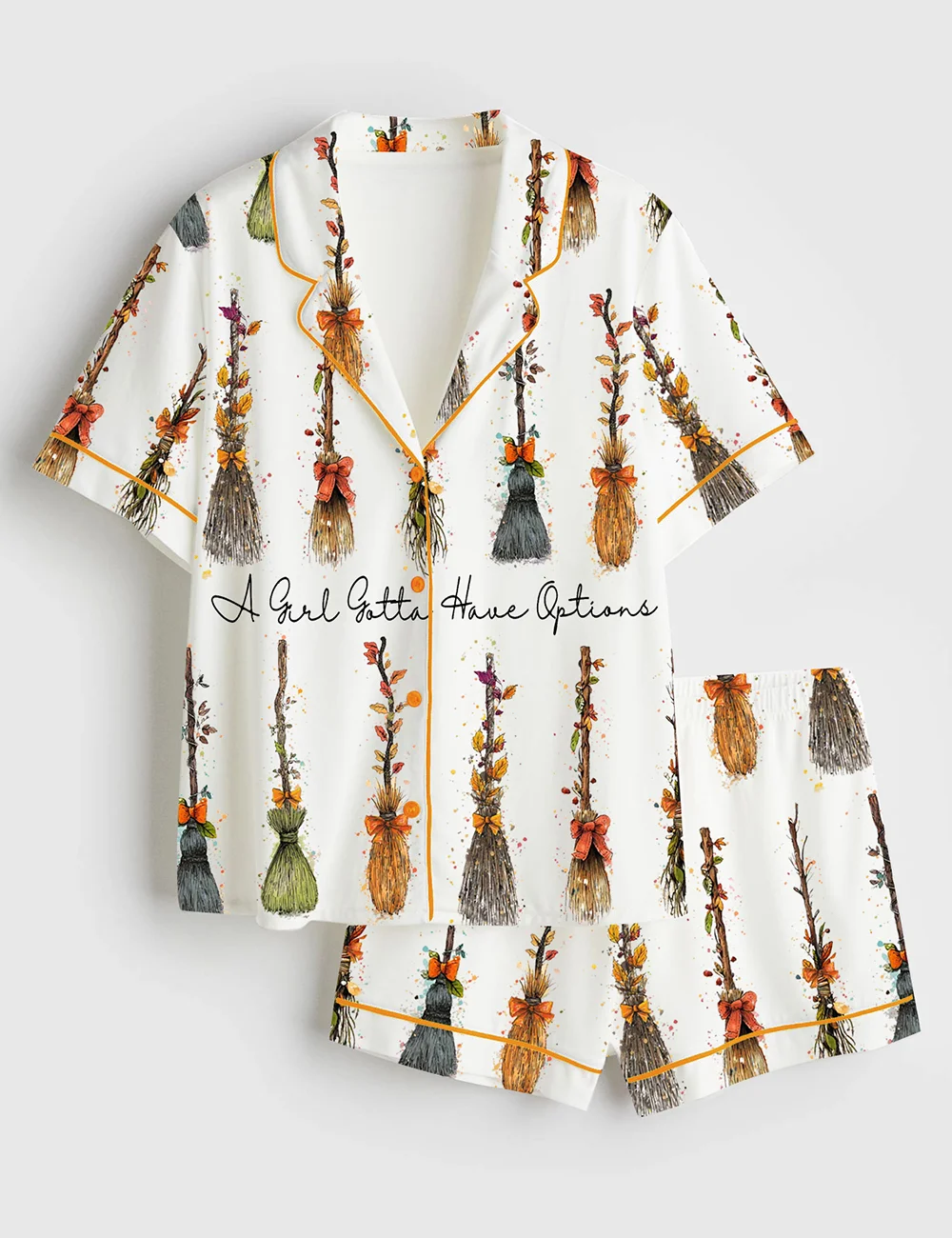 Embrace classic Halloween charm with this Women’s Retro Satin Pajama Set featuring a playful "A Girl Gotta Have Options" witches theme.