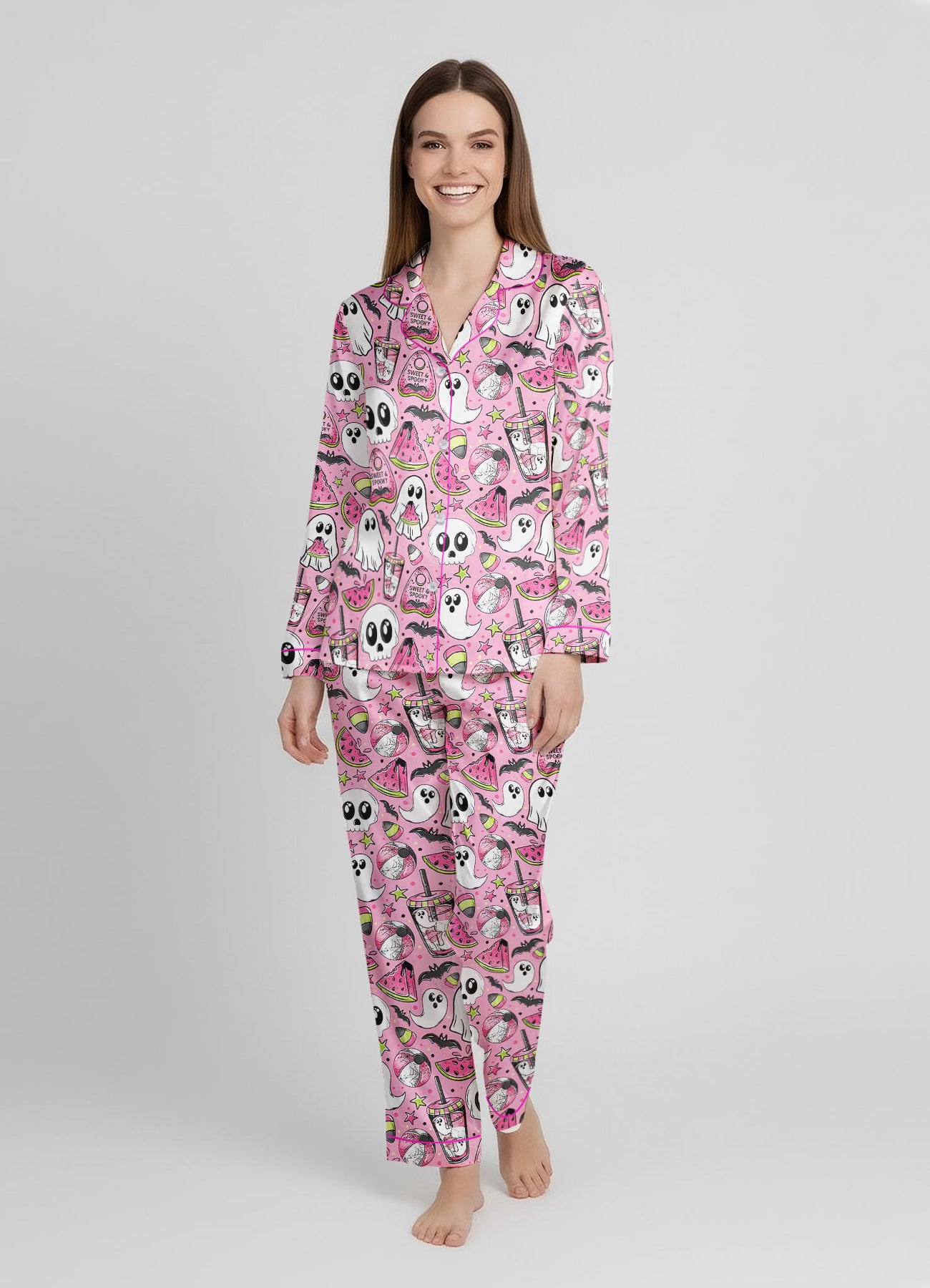 Featuring a whimsical spooky watermelon ghost print, this set combines playful seasonal motifs with gentle, soft fabric ideal for comfortable wear.