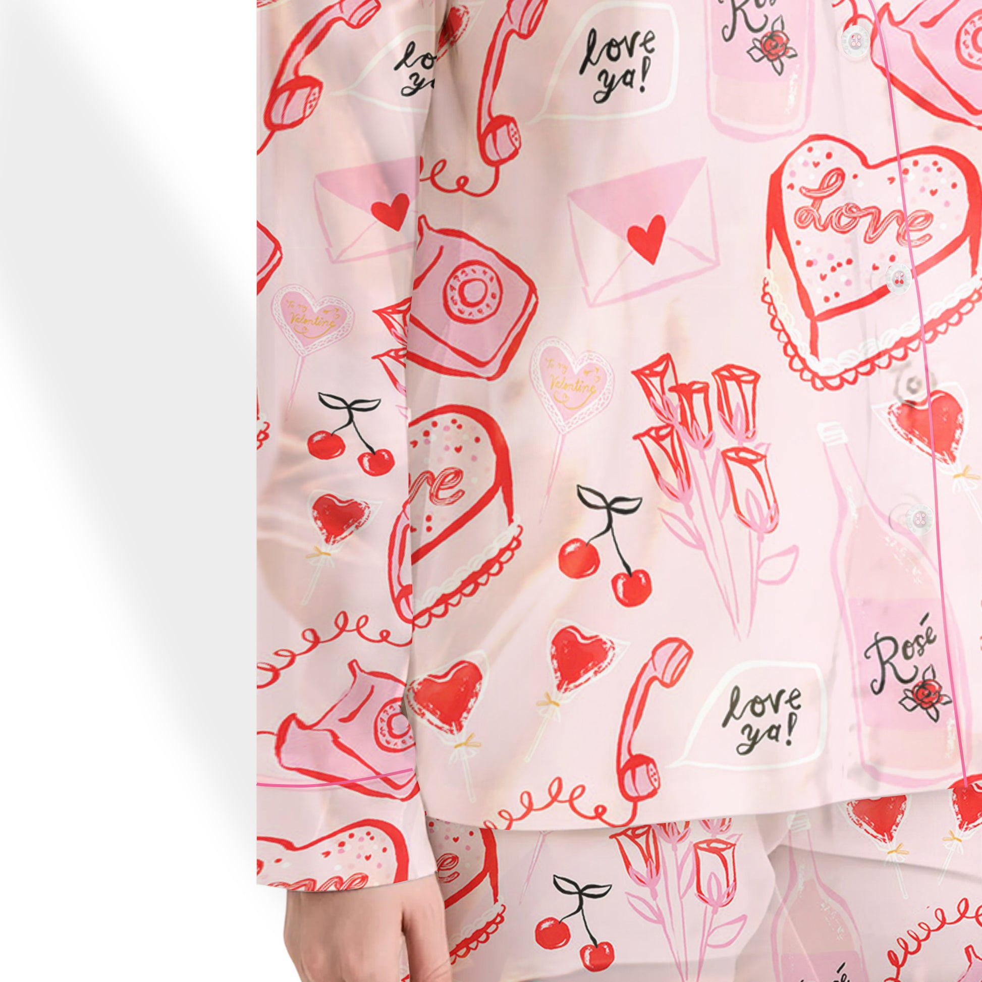 Featuring whimsical heart-shaped lollipop prints, delicate rose motifs, and bold red lipstick accents, this set captures the essence of the season.