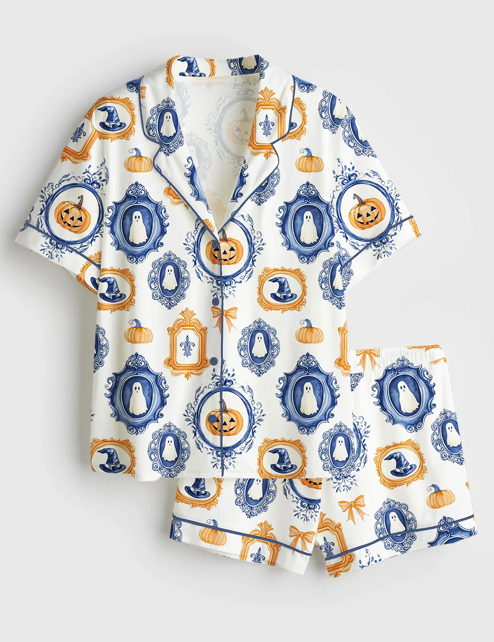 This short sleeve set features a playful mix of pumpkin spice, spooky ghosts, and fall-inspired prints, perfect for Halloween nights or lounging in seasonal style.