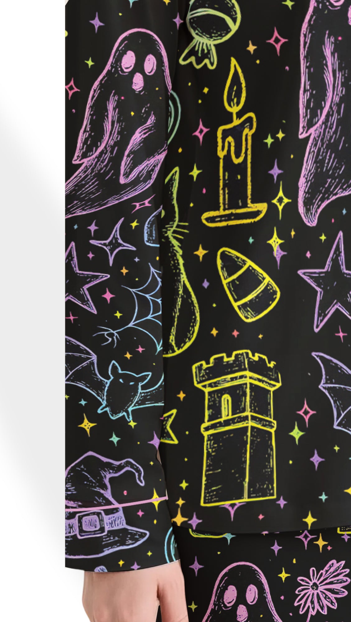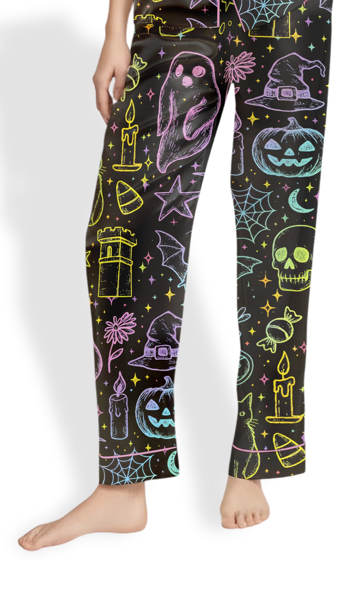 Designed for spooky season enthusiasts, this coquette-inspired set features a neon ghost print that adds a playful, eerie charm ideal for horror movie nights and Halloween celebrations.