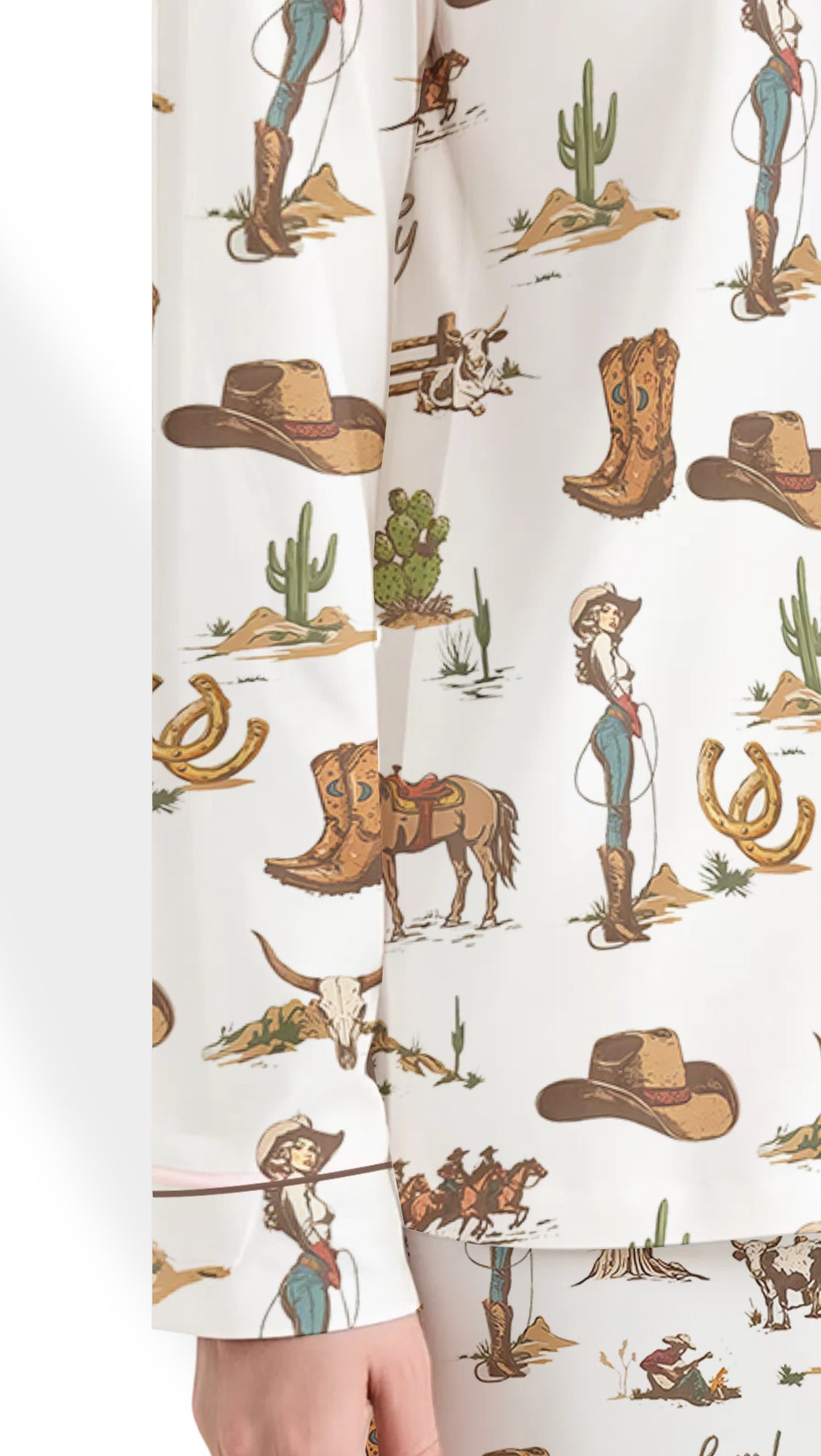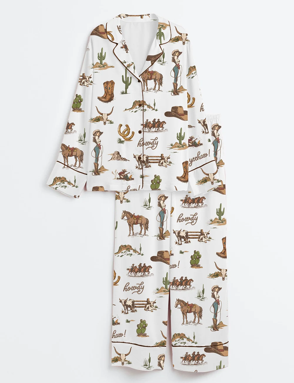 Featuring a nostalgic cowboy and Americana-inspired print, this long sleeve set combines vintage aesthetics with modern comfort.