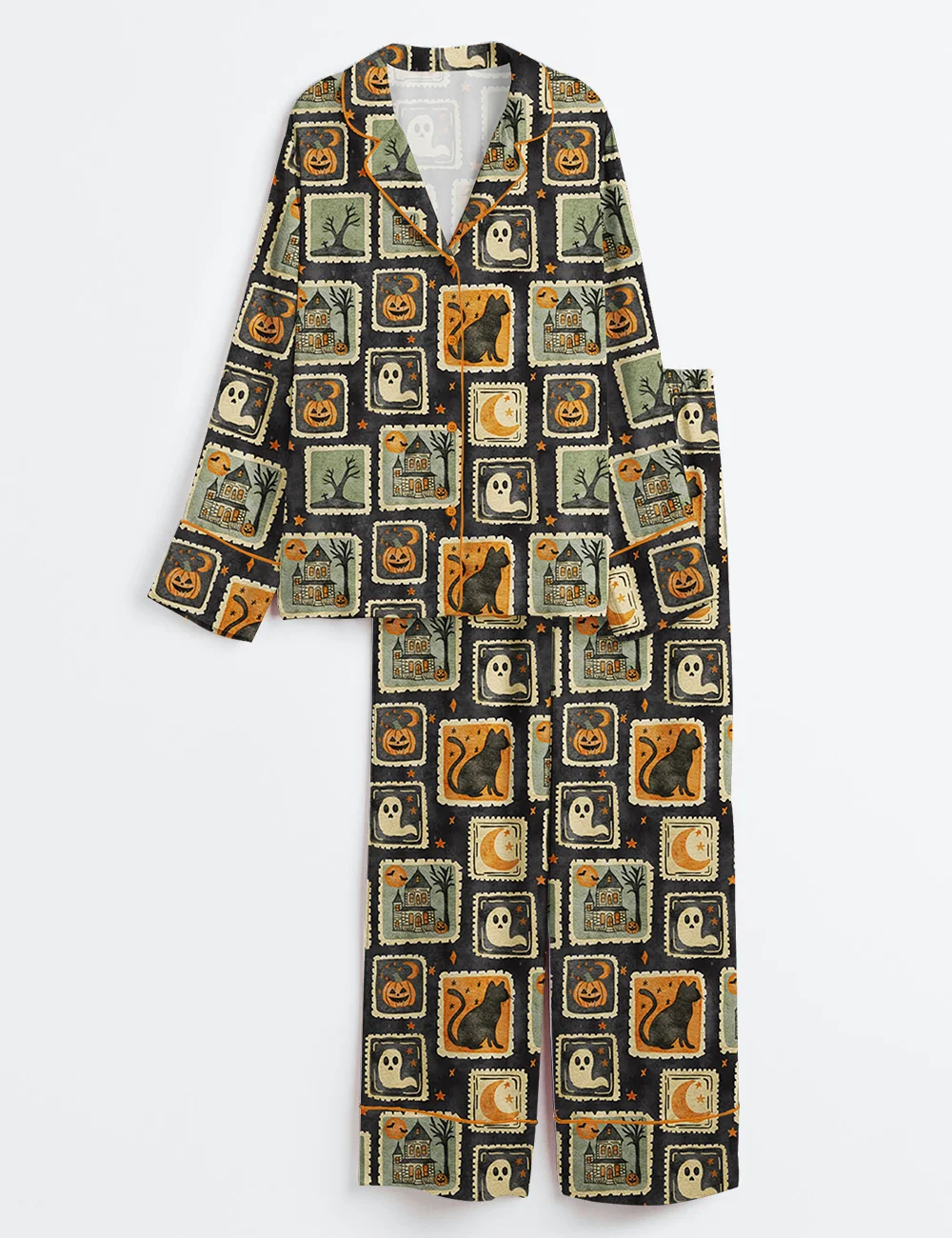 Women’s Watercolor Halloween Pajama Set – Ghost, Black Cat & Haunted House Satin PJs